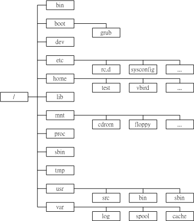 由屬性的角度來看,上面的檔名每個都是『目錄名稱』,較為特殊的是 root ,由於 root 這個目錄是管理員 root 的家目錄,這個家目錄可重要了!所以一定要設定成較為嚴密的 700 ( rwx------ )這個屬性才行吶!如果以較為完整的樹狀目錄來視察的話,可以將整個 Linux 的樹狀目錄會製程下圖: