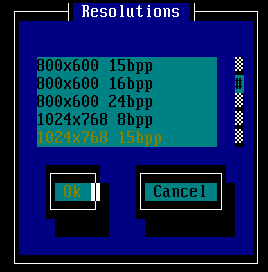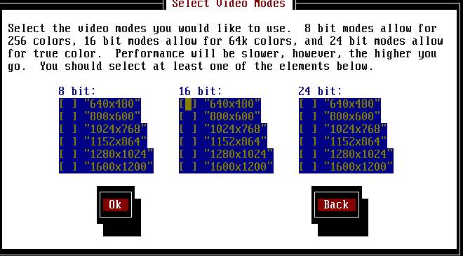 再來則是選擇畫面解析度與色彩量,如下圖所示,一般而言,如果你的 X-Window 一直有問題,這裡可以選擇 8 bit,及 640x480 的最原始設定就好!如果你的 X-Window 沒有問題,可以正常的使用了,而你覺得你想要讓你的色彩最大化,則可以僅選擇 24 bit 及 1024x768 這一項即可!如此一來,你就可以以你最喜歡的解析度與色度進入 X-Window 啦!(注意喔,在 bit 之間以 tab 鍵移動,而以 空白鍵 確定!)