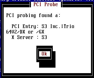 這個時候會出現一個歡迎畫面,按下 OK 之後,系統會自動去捉顯示卡的晶片組。 如果顯示卡是這一版的 XFree86 有支援的話,那系統就會顯示出你的顯示卡型號,如下圖所示為 S3 的 Trio64v2 晶片: