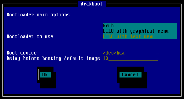 其實這個就是 /usr/sbin/drakboot 這支程式啦!他的功能亦即是我們在開機流程的內容所提到的 LILO 與 Grub 內容,就是進行開機管理啦!按下這個功能之後會出現如下的圖示: