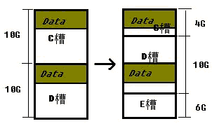 - 然後以 Spfdisk 將該硬碟的 FAT 表進行分割,注意喔!只是分割 FAT 表,並沒有 format 喔!不過這裡的技術性很高,需要特別注意!因為你是將 FAT 表重新劃分,所以你的資料必須要在同一個磁區內!好了,我就將原本的 10GB 10GB 切割成 4GB、10GB與 6GB 三槽!而且在 spfdisk 的幫助之下,順利的在沒有任何資料遺失的狀況下,將我的硬碟由原先的兩槽分割成三槽囉!那麼一來,我就可以在我原本的 D 槽裡面安裝 Linux 啦!方法有點像底下的圖示: