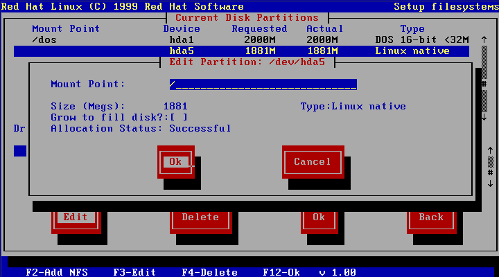 好啦!硬碟終於分割好啦,那接下來要做的就是灌 Windows98 啦!說實在的,玩個人電腦的朋友們, Windows98 不灌個幾十遍以上是不可能的,因為 Windows98 有個別名叫做『暈倒九八』,就是要灌到暈倒 98 次以上才會成精!哈哈!當然這是個笑話,不過這個笑話裡隱藏了一個很大的問題,就是 Windows98 或 Windows ME 的不穩定性。當然了,如果你對於 Windows2000 或 Windows NT 有興趣的話,那你可能會說『微軟出的東西不錯呀!』就連玩硬體的玩家都知道的『湯姆的五金店』對於微軟這款 Windows2000 都讚譽有加,不過湯姆的五金店中也說了,微軟根本不希望 Windows2000 可以賣的好,因為如此一來使用 Windows 的客戶將不想要再繼續升級其作業系統,因為 Win2000 實在是太穩定了,那微軟賺啥???這或許是上述這個網站對於微軟過去行為的不諒解,不過也可以說明在個人電腦上使用的 98 核心的不穩定性了!說到這裡實在是有點離題,好,回歸主題! Windows98 在 1GB 的硬碟空間要灌到怎樣的地步呢?其實只要能開機就可以了!因為後續的安裝可以在你 Linux 系統裝完之後再繼續安裝,因為 Linux 安裝完畢之後,你的這部機器就可以使用多重開機了,當然 Windows 既然可以開機當然也可以繼續他未完成的安裝啦!