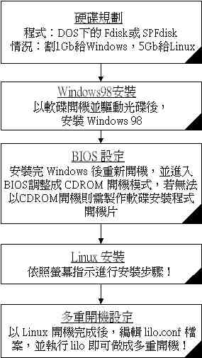- 由於我需要進行多重開機的設定,然而 Linux 本身的強悍功能可能會讓你的 Windows 沒有辦法在安裝了 Linux 後還能順利安裝完畢,所以這裡要說的是:『請先安裝了 Windows98 之後再安裝 Linux!』,否則等你安裝完了 Linux 之後,要再安裝 Windows 可能要花上好一番功夫囉!安裝流程如下圖所示: