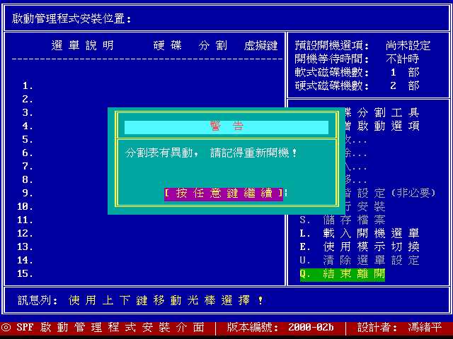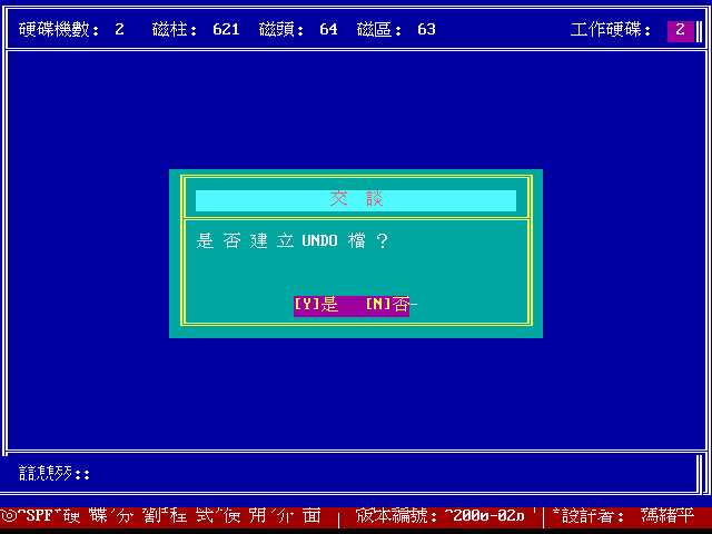 這裡的動作是連續的:4. 格式化硬碟這樣一來你的硬碟就劃分完畢而且貯存啦!這時要做的就是重新開機並格式化硬碟。格式化硬碟可以使用 DOS 的 Format ,當然也可以使用 spfdisk 的內建功能喔!