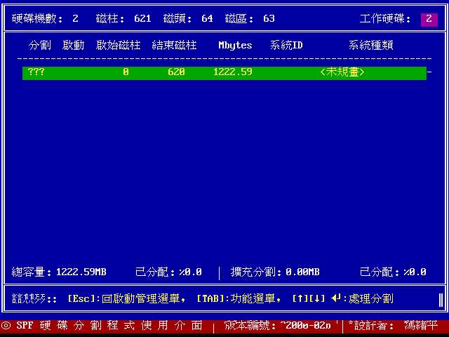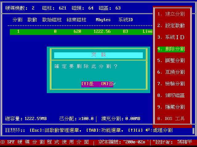 SPFdisk 是一套由國人開發完成的全中文介面的硬碟分割工具,他要比微軟出的 Fdisk 功能強多了,他的好處除了==>全中文介面讓你一定可以看的懂之外,簡單的類圖形介面可以讓你輕易的進行硬碟分割,除此之外,這套軟體的『DOS工具』內的『格式化工具』格式化硬碟的速度真是 DOS 比不上的,我格式化一個 30GB 的硬碟不用十秒就可以格式化完全!<==另外,其他的優點我在此也不多說了,若有需要你可以自行自一些搜尋網站下載最新的程式,或從這裡下載我有的程式,不過可能舊一點。另外,由於 DOS 的 Fdisk 並不認識 Linux 的分割表,所以用 DOS 的 Fdisk 是無法將 Linux 的分割表去除的。因此,你要刪除 Linux 的分割表,只有兩個比較快的方法,一個是以 Linux 直接再分割,一個則是使用 SPfdisk 分割啦!