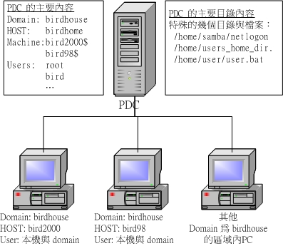 [global] #1.底下為一般設定項目(主機名稱、工作群組等) workgroup = birdhouse netbios name = birdhome server string = Bird's testing SAMBA Server client code page = 950 #2.密碼與登錄檔相關的資訊! security = user encrypt passwords = yes smb passwd file = /etc/samba/smbpasswd log file = /var/log/samba/%m.log max log size = 0 socket options = TCP_NODELAY SO_RCVBUF=8192 SO_SNDBUF=8192 #3.其他與 domain 有關的參數 os level = 64 preferred master = yes domain master = yes local master = yes domain logons = yes logon script = startup.bat ; logon script = %U.bat logon path = \\%L\Profiles\%U wins support = yes dns proxy = no time server = yes # 在上面的設定當中,都是與 domain model 有關的參數 # os level 表示與其他主機相比,這部 SAMBA 機器的管理等級,設高一點 # domain logons 表示這部 SAMBA 主機可以提供 Widnows 登入的服務 (PDC) # logon script 表示當使用者登入之後,要到哪裡去執行他的 profile 設定檔, # 我這裡將每個使用者登入時,都要去執行 startup.bat 這個檔案, # 這個檔案放置的地方其實就是底下 [netlogon] 的 path # 設定的目錄,請特別留意 domain 與 netlogon 的關係! # 底下則設定每個使用者的家目錄! [homes] comment = Home Directories browseable = no writable = yes valid users = %S create mode = 0664 directory mode = 0775 # 有特定帳號者可以使用底下這個設定 [netlogon] comment = Network Logon Service path = /home/samba/netlogon writable = no write list = bird root follow symlinks = yes guest ok = yes # 沒有特定帳號者,例如 Windows 98 的使用者,會使用底下的路徑! [Profiles] path = /home/samba/profiles read only = no create mask = 0600 directory mask = 0700 browseable = no [tmp] comment = Temporary file space path = /tmp read only = no public = yes [root@test samba]# grep -v '^#' smb.conf |grep -v '^;'|grep -v '^$' # 這個動作在確認一下上面的設定是否相同,因為有時候可能會忘記將某個 # 設定給註解掉呢! ^_^ [root@test samba]# testparm | more [root@test samba]# /etc/rc.d/init.d/smb restart |