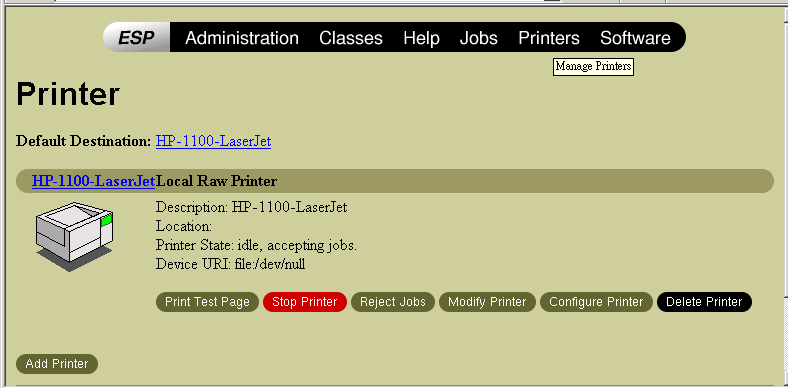 root]# lpadmin -p HP-1100-LaserJet -m laserjet.ppd