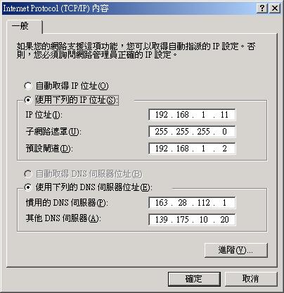 • Windows 個人電腦上的設定:在個人電腦方面,由於我們已經設定了 NAT 主機,這一個主機有一個固定的虛擬 IP 、子遮罩網路,因此,Windows 系統則直接輸入: