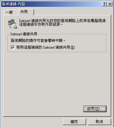 然後將『啟動這個連線的 Internet 連線共用』打勾,再按確定,會出現下面的畫面: