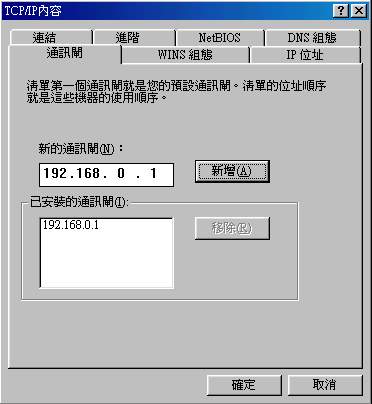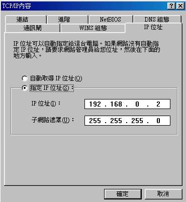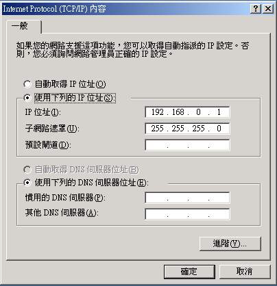 在主機端設定完畢之後,用戶端的設定就簡單很多啦!因為你已經知道你的通訊閘是 192.168.0.1,所以你要先確定連線上這部主機的其他電腦有幾部,在這些欲連上主機的電腦的 IP 必須是 192.168.0.XXX,其中XXX為 2-254 之間的整數,且『每一部電腦的 IP 都不可以相同』,好啦!讓我們來做設定吧!