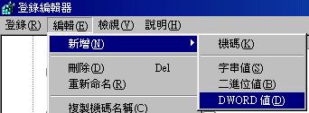 上面最後一個數據是 000n,那個 n 指的是數字,以我為例,在 NetTrans 底下有兩個數字,分別為 0000 與 0002,若按下 0000 會顯示我的 Gate Way 以及我的網路卡的 IP 項目,至於 0002 則沒有我的網路卡的相關資訊,所以 0000 那這一個就是我的網路卡介面啦!請依你的情況選擇!- 選擇你的網路卡介面後(以我為例,按一下 0000 那一個機碼),按下『編輯』>『新增』,然後選擇增加『DWORD』值;