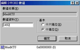 - 將新增的機碼取名為『MaxMTM』,並且在新增加的那個機碼上面按右鍵,選『修改』,會出現如下畫面,選擇『十進位』後,輸入剛剛我們找到的那一個 MTU 值: