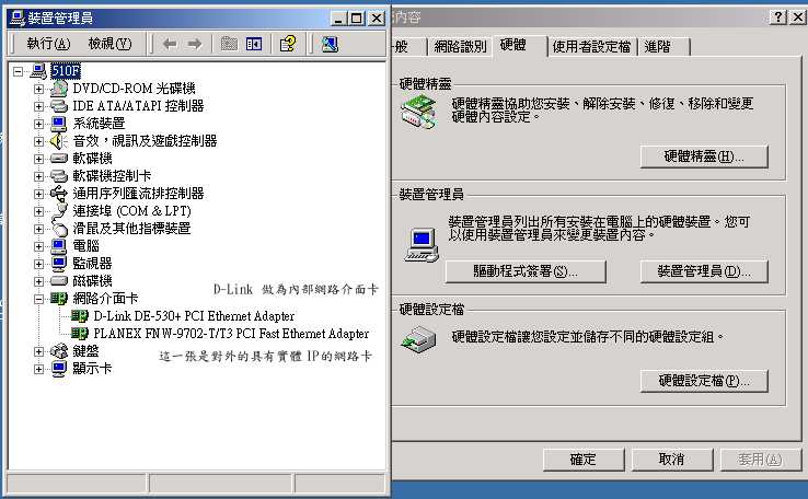 上圖中,我們選擇 D-Link 做為內部網路而 PLANEX 則做為外部網路的界面卡。要注意的是『硬體裝置中是否有出現?符號的咚咚!如果有,那就是該裝置有問題,請更新其驅動程式吧!如果沒問題的話,就可以關掉這個視窗囉!