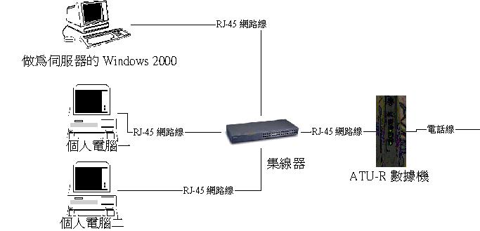 6. 如果你是一個企業的內部網路網管人員,這種連接方式會是比較不錯的,因為所有的電腦均需要透過你這部 Win2000 的電腦之後,才可以與外界連線!所以你可以很容易的掌控住你企業內部的資料流向!當然,這種連線方式也是有點問題的,就是,你的 Win2000 主機『一定不能掛點』,因為主機掛點,所有的電腦都將無法與外界連線嚕!!另外,由主機到 ATU-R 的連線是以『跳線』來連接的!當然囉,如果你將 Win2000 主機以 『IP分享器』(或其他的硬體設備)來取代,也是可以的!!
