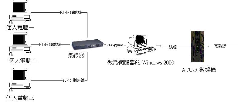 4. 這種連線方式的特色在於,當做為主機的 Windows 2000 那部電腦不開機的時候,其他的個人電腦仍然可以藉由撥接程式來連接上網!亦即 Windows 2000 的主機與其他的個人電腦的地位是相同的;而當比較多部的電腦同時上網時,作為 Server 的 Win2000 就一定要開機,而且其他的電腦可以直接藉由 Hub 連上這部 Win2000 主機後(不用再撥接喔),經由 Win2000 的中介,而透過 ATU-R 與 Internet 連線!是一種比較具有彈性的連線方式!(注意! Win2000 主機需要有兩塊網卡,且以兩條正常的 RJ-45 網路線連接到 Hub 上面)