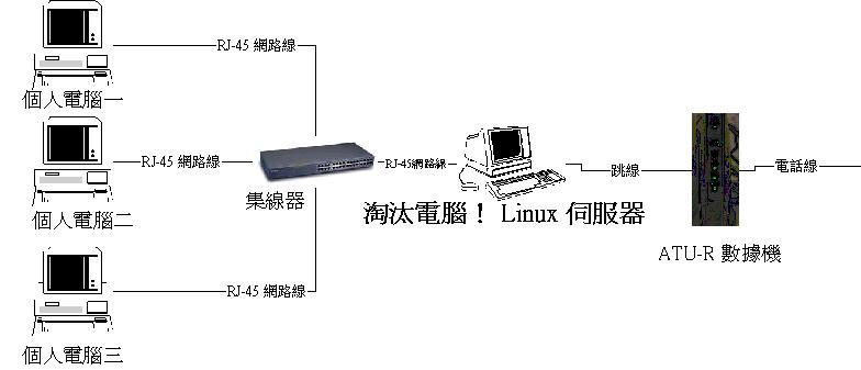 • 適合計時制與固定制的 ADSL ,主機需要兩張網卡,需要一個 Hub 與跳線一條!