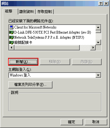 五、增加有用的通訊協定設定(針對區域網路)由於區域網路是由一些網路的通訊協定所驅動形成的(關於各種通訊協定請參考 study-area 的說明),所以請一定要在網路的組態內加入下列的通訊協定,當然,在您網域內的所有電腦均需要做以下的設定!要確認您的設定有沒有問題,請到這裡一步一步的檢查一下您的設定喔!OK!那我們開始安裝通訊協定吧!
