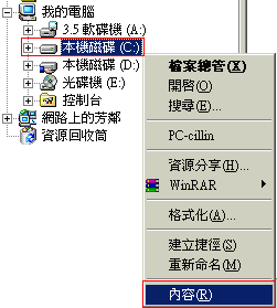 六、啟動網路上的芳鄰與資源分享裝置在檔案總管中,在想要分享的磁碟機或者是資料夾按滑鼠右鍵點選【內容】,如下圖所示: 在下圖中核選【資源分享】,請設定資源分享的名稱,然後存取類型可依個別喜好來設定,如果你這個資料很重要,不希望被刪除掉的話,最好選擇唯讀;但如果是一般家庭的網路系統的話,通常就直接設『完整』了,反正都是自家人,應該不會有人殺掉你的資料吧!!然後密碼可以設也可以不設。要注意的是,如果你選擇了『按照密碼決定』時,你就必須要輸入兩組密碼喔! 基本上,以上的設定就已經足夠了,再接下來就是每台電腦之間的連接方法了!