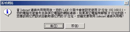 這個地方告訴你,你的內部網路的那張網路卡,已經被設定為內部網路的通訊閘,而且通訊閘的