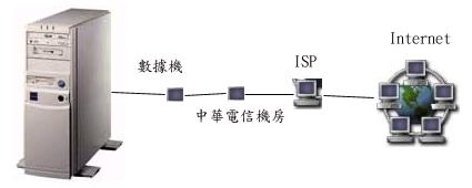 - 使用數據機(56Kbps 或是 ADSL 的小烏龜數據機)連上你的 ISP :這個連線方式比較常發生在只有一部電腦的一般家庭用戶,由於只有一部電腦,因此需要檢查的步驟則只有『網路線及數據機』兩個東西。連線的方式可以圖示如下: